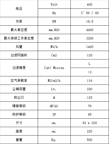 聚酯纖維過濾網(wǎng)安裝和保護(hù)在鋼鐵過濾桶里,星型濾袋可使過濾網(wǎng)面積達(dá)120000 cm2并且具有高過濾功效(3微米)。安裝有空壓機(jī)的自動清潔震塵系統(tǒng)可通過垂直振塵運(yùn)動高效持續(xù)地清潔過濾網(wǎng)(頻率及長度可設(shè)置調(diào)整),最終讓大部分灰塵掉落保持過濾網(wǎng)干凈,這樣能夠延長它的使用壽命和確保吸塵功效。前部鋁質(zhì)以印模壓鑄的吸塵接口(直徑120毫米)放置在過濾網(wǎng)下方,因此不用取出或更換過濾網(wǎng)就可以同時(shí)灰塵和固體等物質(zhì)。過濾筒內(nèi)一個(gè)旋風(fēng)分離器直接將絕大部分的灰塵直送入集塵桶,能保護(hù)過濾網(wǎng)不被割破或撕開。