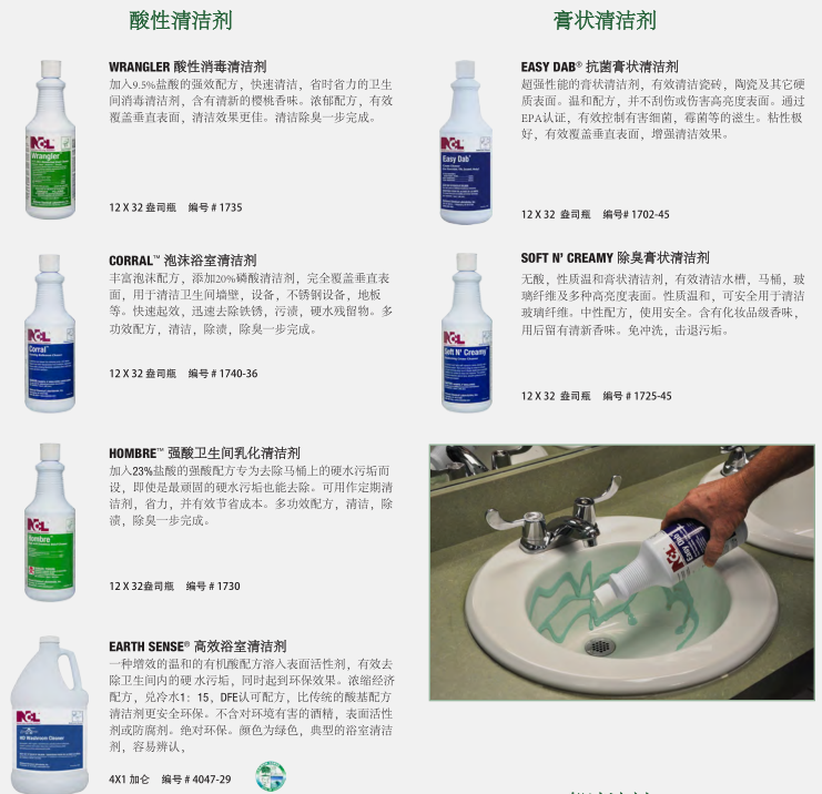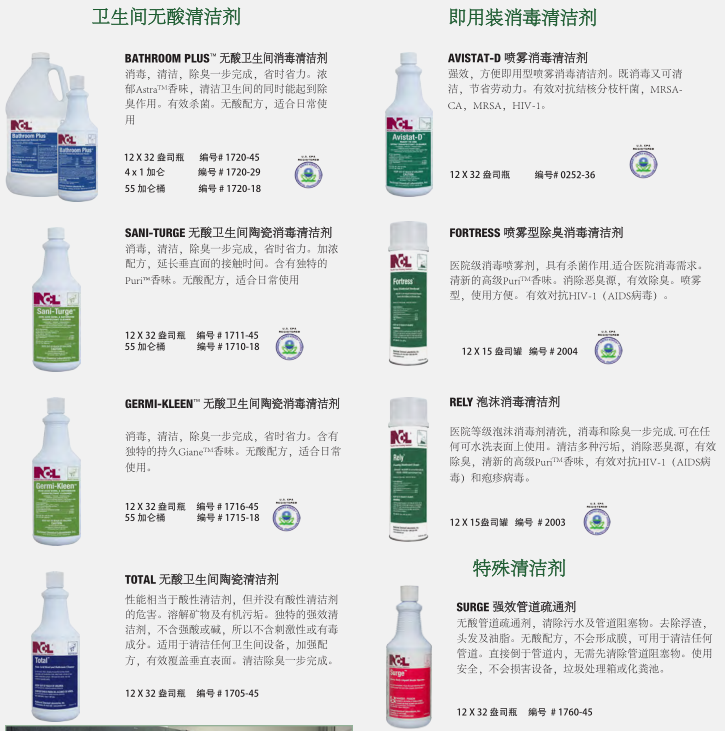 干凈、衛(wèi)生的衛(wèi)生間反映了設施的整體清潔程度。NCL的衛(wèi)生間清潔系統(tǒng)提供了最先進的清潔、消毒和除臭產品,以確保最大功效的控制衛(wèi)生間環(huán)境中致病細菌。對于地板,墻壁,和其他表面,你也會找到一個更完整的程序。健康 經(jīng)濟 的清洗方案可以選擇適合清潔人員使用的化學輸送系統(tǒng)。低成本的傳統(tǒng)包裝提供最大的靈活性。稀釋控制管理系統(tǒng)提供稀釋狀態(tài)下各種各樣的產品,以達到最佳效果。
